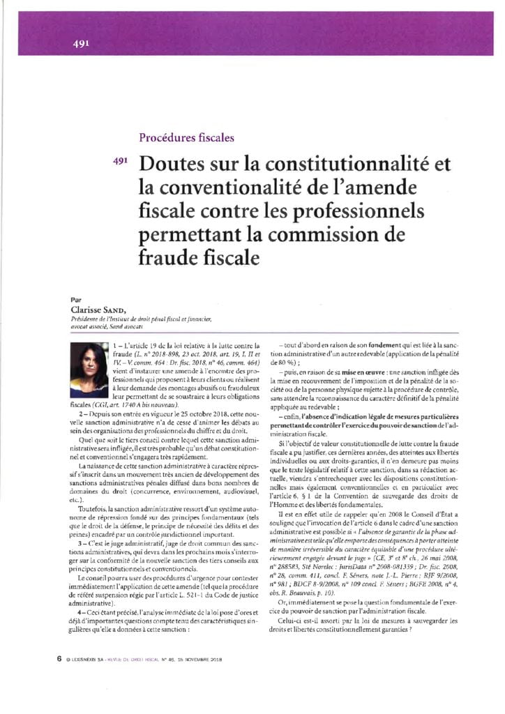 Article : Doutes sur la constitutionnalité et la conventionnalité de l’amende fiscale contre les professionnels permettant la commission de fraude fiscaleDans la revue de droit fiscale LexisNexis, Maître Clarisse SAND, avocat au barreau de Paris, membre de l’Institut de Droit Pénal Fiscal et Financier (IDPF²) vient de publier une étude sur « Doutes sur la constitutionnalité et … ARTICLE: Sur l'amende administrative des conseils tiers complices